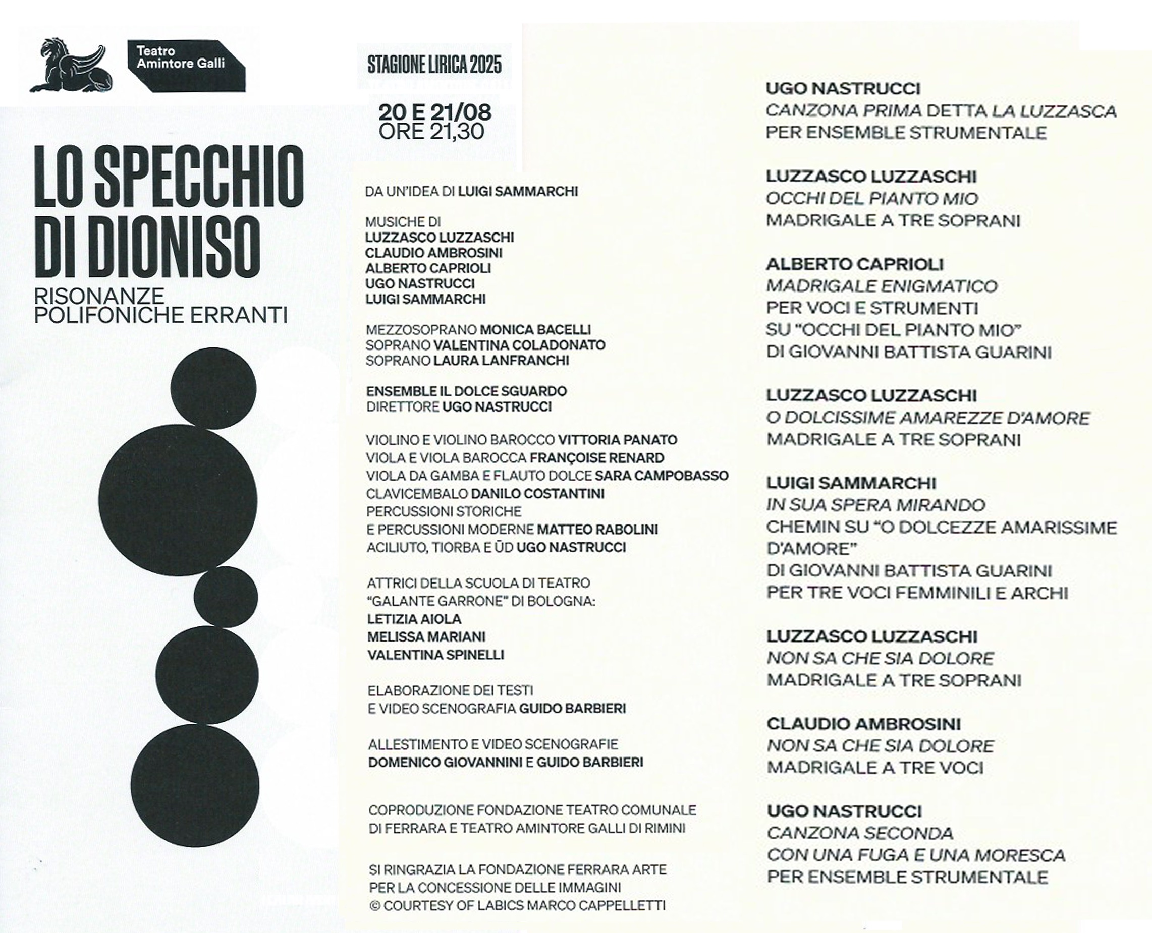 | 2025 Aug. 20,21 | RIMINI | TEATRO AMINTORE GALLI | LO SPECCHIO DI DIONISO. RISONANZE POLIFONICHE ERRANTI. FROM AN IDEA OF LUIGI SAMMARCHI MONICA BACELLI, LAURA LANFRANCHI, VALENTINA COLADONATO, VOICES. ACTRESSES OF SCUOLA DI TEATRO A. GALANTE GARRONE ENSEMBLE “IL DOLCE SGUARDO”, UGO NASTRUCCI, COND. GUIDO BARBIERI, DIRECTOR MUSICHE DI LUZZASCO LUZZASCHI, CLAUDIO AMBROSINI, UGO NASTRUCCI, LUIGI SAMMARCHI, ALBERTO CAPRIOLI, (MADRIGALE ENIGMATICO ON “OCCHI DEL PIANTO MIO” BY GIOVANNI BATTISTA GUARINI, FOR VOICES AND INSTRUMENTS) |